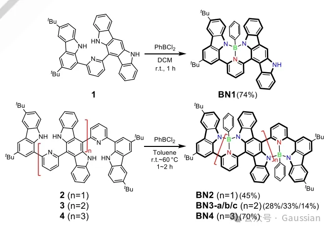 示意图1. BN1到BN4亲电硼化反应的合成路线