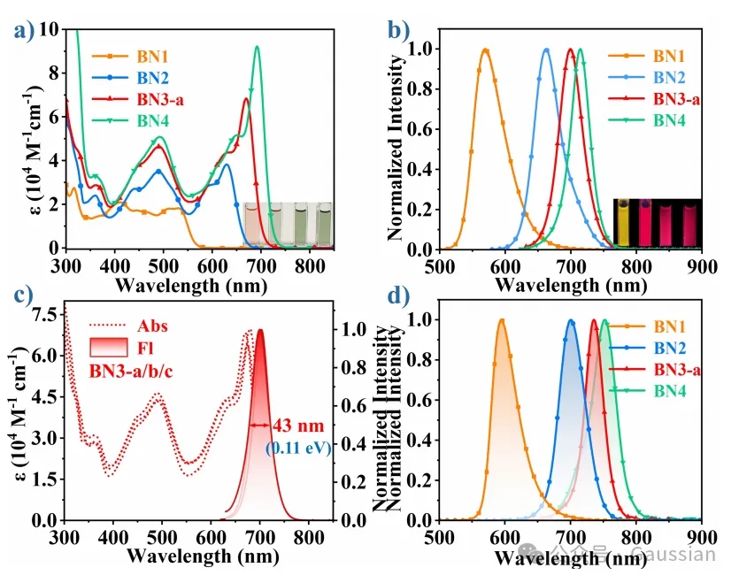 图3. BN1-BN4在甲苯溶液(1.0 × 10-5 M)的a) 紫外-可见吸收光谱和b) 荧光光谱。插图照片显示BN1-BN4的颜色 (a)和荧光颜色 (b)。c) BN3-a/b/c的紫外-可见吸收光谱(破碎)和荧光光谱(实线)。d) BN1-BN4在甲苯溶液(1.0 × 10-3 M)中的荧光光谱。