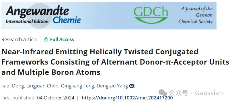 2024年10月4日,万象城娱乐awc线路杨登涛、冯晴亮团队在Angewandte Chemie International Edition期刊发表题为“Near-Infrared Emitting Helically Twisted Conjugated Frameworks Consisting of Alternant Donor-π-Acceptor Units and Multiple Boron Atoms”的研究论文,团队成员董佳祺为论文第一作者,冯晴亮、杨登涛为论文共同通讯作者。
