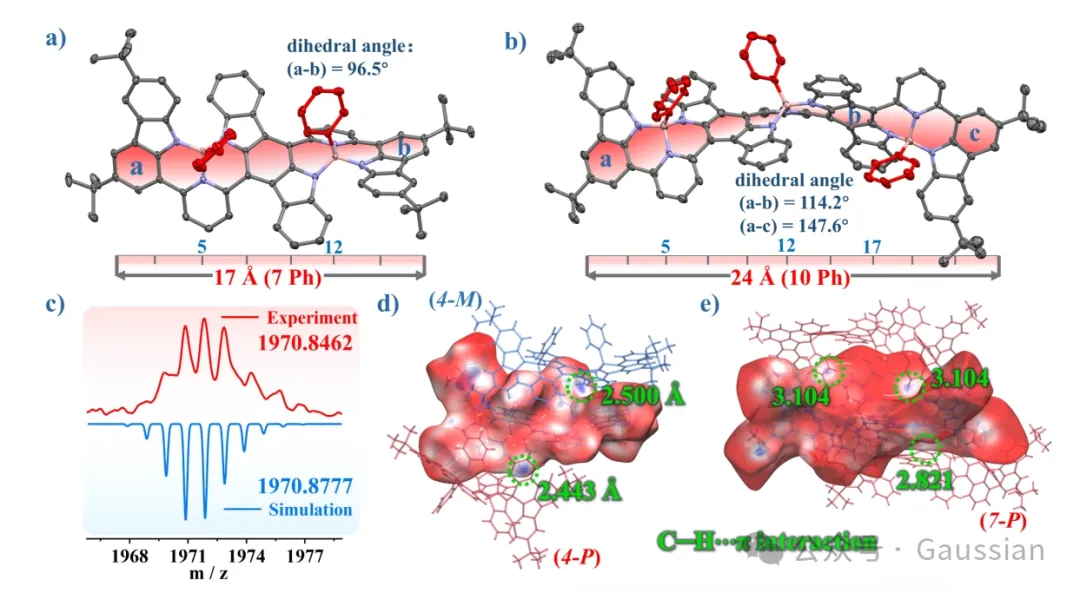 图2. a) BN2和b) BN3-a的单晶结构,结构下的比例尺表示了中心纳米带的长度每个苯基环两边键中心的距离之和。为了清晰起见,省略了氢原子,所有椭球都以30%的概率水平绘制。c) BN4的MALDI-TOF MS谱,显示了实验和模拟的m/z值。d) BN2和e) BN3-a的Hirshfeld表面分析。相互作用用颜色表示:红色表示可忽略相互作用,白色表示弱相互作用,蓝色表示强相互作用。BN2的M-手性四螺旋烯(4-M)用蓝色表示,P-手性形式(4-P)用红色表示。BN3-a的M-手性七螺旋烯(7-M)用蓝色表示,P-手性形式(7-P)用红色表示。