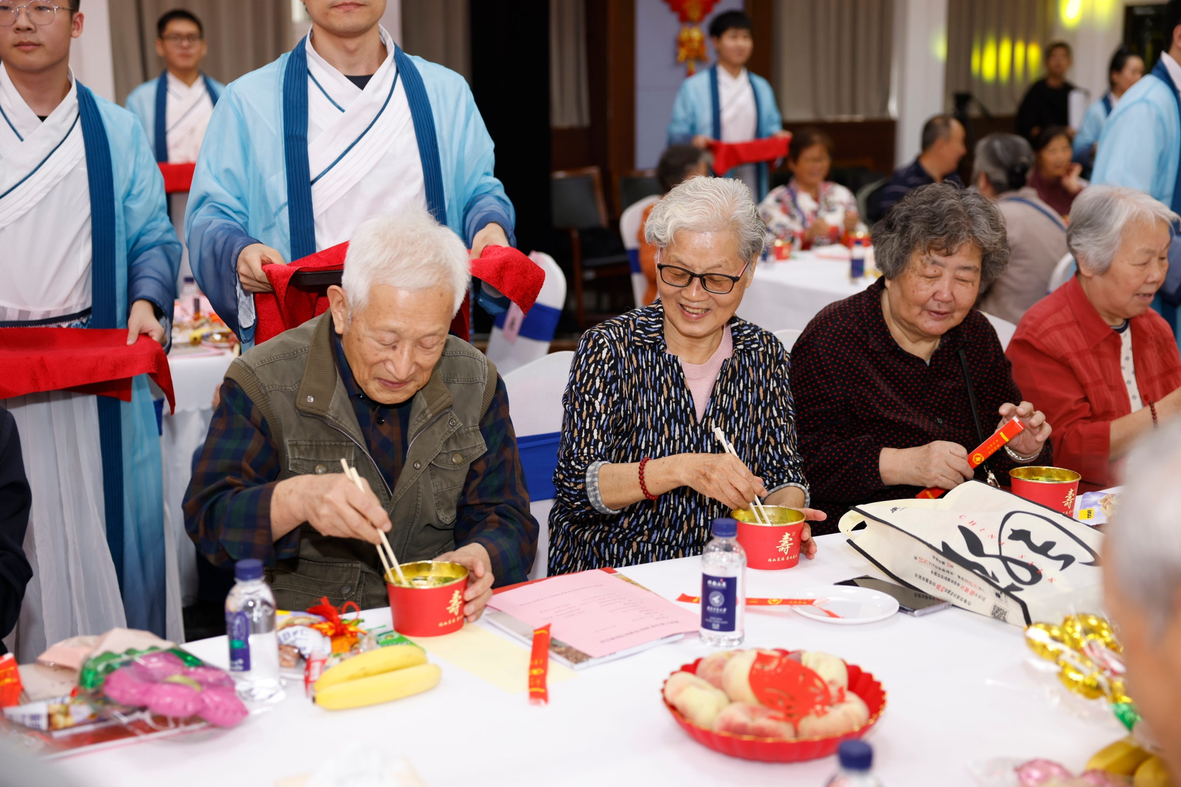 一碗长寿面,承载着千年来尊老爱老的温情与祝福。由陕西民俗文化艺术团带来的表演《欢乐礼面行》生动有趣,42名学生身着传统服饰为现场的长者端上爱心暖暖的长寿面。热气腾腾的长寿面凝聚着全校师生的美好祝愿,整个会场欢声笑语、喜气祥和。