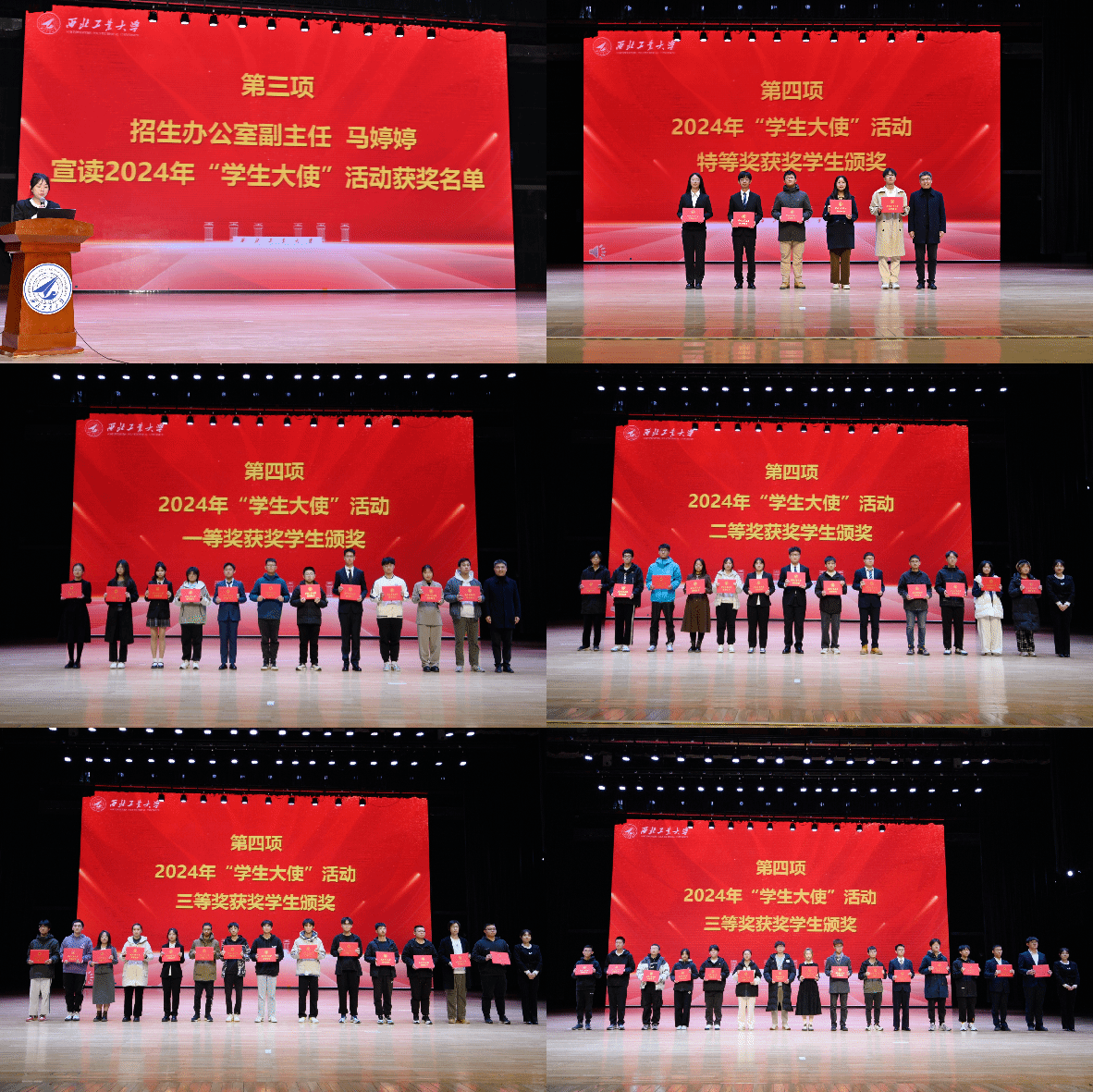 接下来,招生办公室副主任马婷婷宣读2024年优秀“学生大使”团队及个人名单,共计有5支队伍、2名个人荣获特等奖,11支队伍、6名个人荣获一等奖,21支队伍、12名个人荣获二等奖,47支队伍、33名个人荣获三等奖。王克勤、马婷婷分别为在2024年“学生大使”回访中学母校活动中获奖的团队和个人代表颁奖。