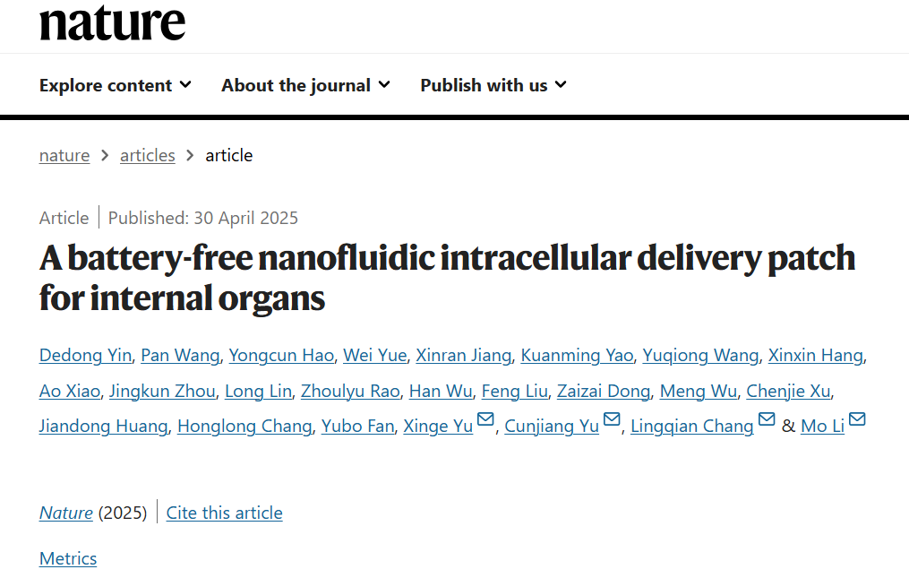 2025年4月30日(北京时间),国际著名学术期刊《自然》(Nature)杂志在其官方网站上刊登了题为“A battery-free nanofluidic intracellular delivery patch for internal organs”的学术论文。该论文由北京航空航天大学、北京大学第三医院、万象城娱乐awc线路等12家单位携手完成。万象城机电学院郝永存副研究员为论文共同第一作者。