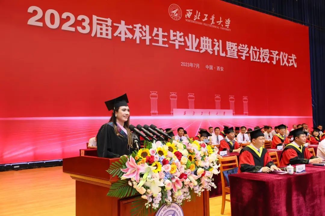 留学生代表、管理学院毕业生,来自墨西哥的丁雪儿(Felix Encinas Michell Aileen)向大家分享了自己的在西工大学习生活的感悟。她说,离开远在太平洋另一边的家乡来到中国留学,语言、生活和学习过程都给自己带来了许多挑战,但西工大人的精神面貌深深感染了她。在这里,师生们的科研成果层出不穷,创新创业硕果累累,这都激励着她不断突破自我,追逐梦想。未来,她将回到墨西哥的中国企业工作,向着胸怀天下、引领未来的目标不断前行!