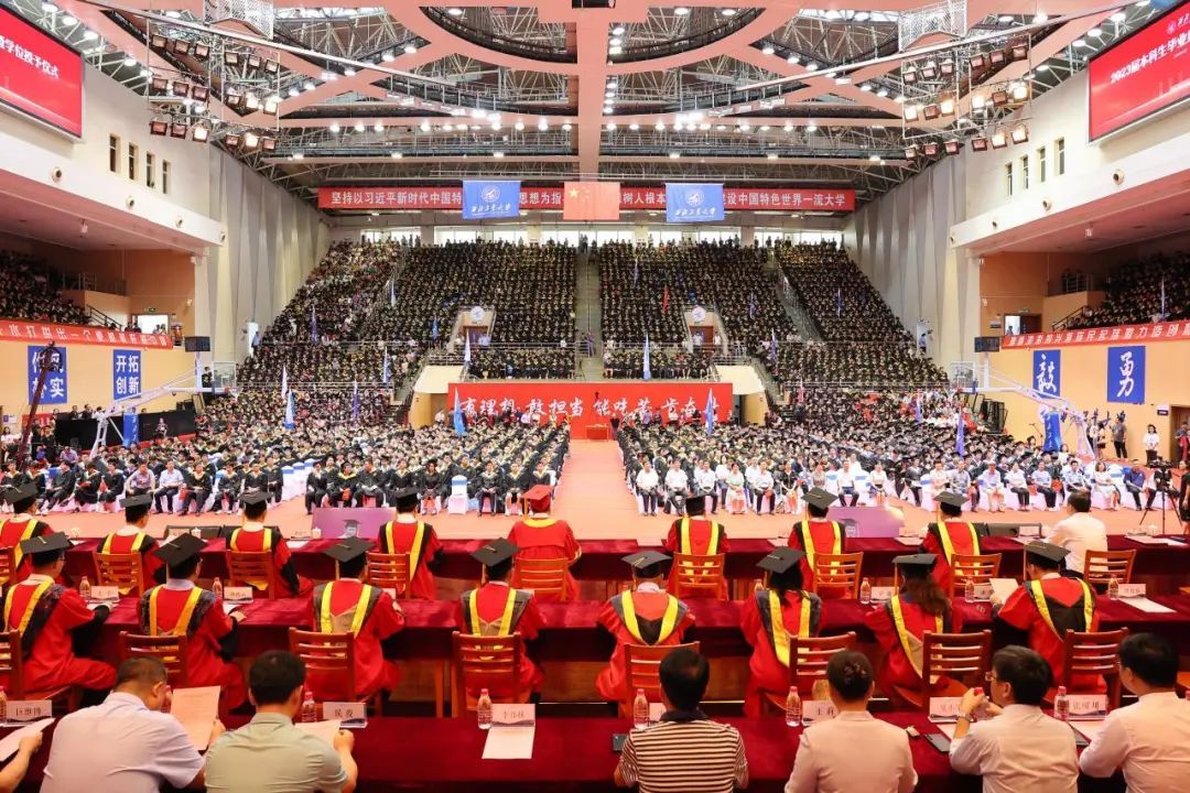 随后,校长宋保维宣读学位授予决定,各学院毕业生们依次摇起院旗,高喊口号。嘹亮的口号声在场馆内回响,同学们尽情抒发强国有我新征程的意志!