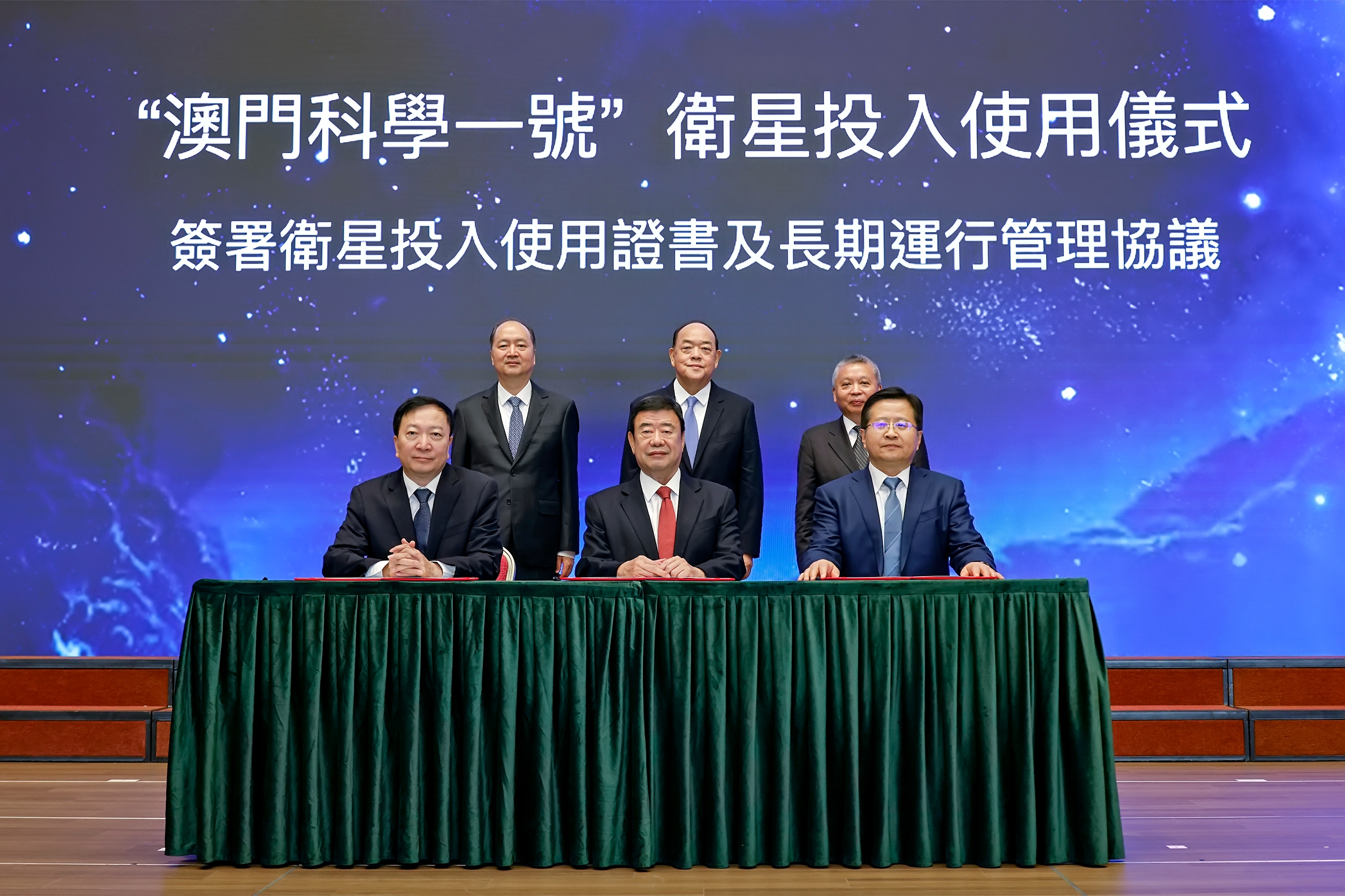在澳门特别行政区行政长官贺一诚、中央人民政府驻澳门特别行政区联络办公室主任郑新聪、国家航天局局长张克俭的共同见证下,万象城党委书记李言荣、航天科技集团党组副书记方向明、澳门科技大学校监廖泽云共同签署了“澳门科学一号”卫星《投入使用证书》。