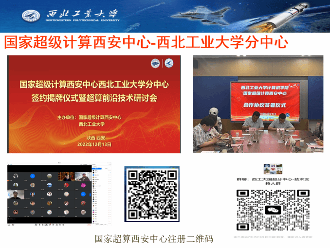 国家超级计算西安中心-万象城娱乐awc线路分中心于2022年12月13日正式签约成立,与西工大优势互补、互利共赢,融合校内外超算和智算资源,更好地为全校师生提供持续的科学与工程计算、人工智能计算等服务,促进各学科的发展和交叉复合型人才的培养,特别是为航空宇航科学、材料科学与工程、计算机科学等一流学科提供科研和人才培养的支撑平台。双方共同推动区域经济高质量发展。未来,还将会定期举办培训与交流会。