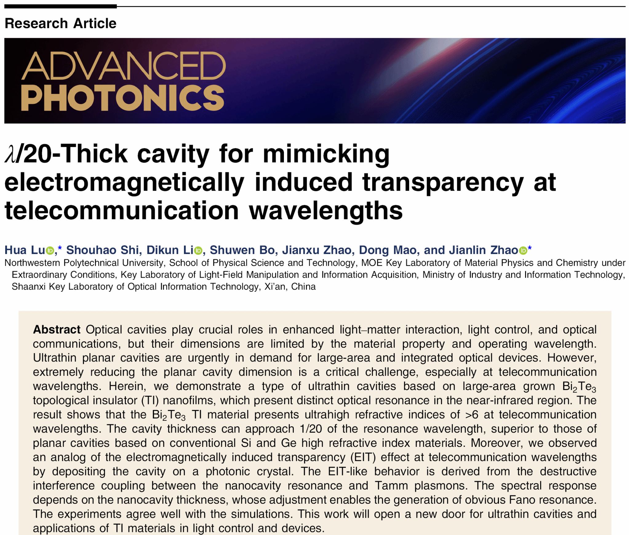 碲化铋拓扑绝缘体在光通信波段具有大于6的超高折射率,其远高于硅、锗等传统材料折射率(硅、锗的折射率分别约为3.47、4.27 @ 1550 nm),研究团队提出了利用碲化铋拓扑绝缘体实现超薄光学共振腔的新思路。他们采用磁控溅射技术制备出大面积、平坦的碲化铋薄膜,并将其与金属薄膜有机结合,实现了超薄光学共振腔(波长的二十分之一)和高效的近红外共振光吸收,如上图所示。进而将该超薄光学腔与一维光子晶体相集成,观测到了反常的类电磁诱导透明效应,并揭示了该效应的产生机理。相关结果为超薄光学腔、微结构光谱调控及光电功能器件的实现开辟了新途径。该研究成果以“λ/20-Thick cavity for mimicking electromagnetically induced transparency at telecommunication wavelengths”为题发表于国际光学领域顶级期刊《Advanced Photonics》(IF:17.3)。