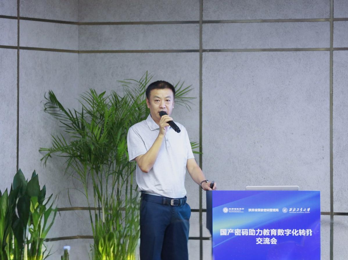 陕西省国家密码管理局商密处处长王勇卫在会上作了精彩的主题报告,对密码相关政策进行了深入浅出的宣讲解读,为与会高校提供了宝贵的政策指导和方向引领。