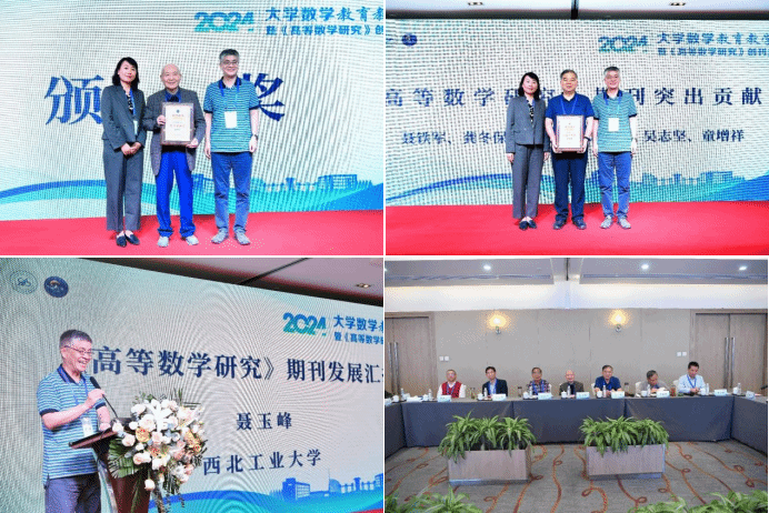10月12日下午,《高等数学研究》编委会还举行了期刊发展研讨会。聂玉峰汇报了《高等数学研究》期刊的发展历史和情况。会议宣布授予期刊前任主编张肇炽教授终身成就奖,授予聂铁军教授、龚冬保教授、叶正麟教授、刘三阳教授、吴志坚教授、童增祥教授突出贡献奖。聂玉峰和王莉分别为张肇炽教授和突出贡献奖获奖代表刘三阳教授颁奖。随后与会编委会成员相继发言,就期刊发展所面临的挑战与机遇展开深入研讨。