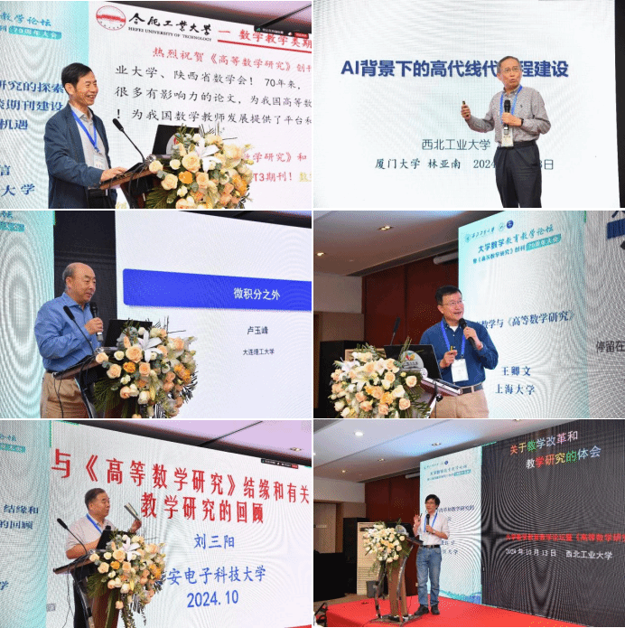 合肥工业大学朱士信教授以《大学数学教学研究的探索与实践——兼谈期刊建设的挑战和机遇》为题、厦门大学林亚南教授以《AI背景下的高代线代课程建设的一些思考》为题、大连理工大学卢玉峰教授以《微积分之外》为题、上海大学王卿文教授以《教育数学与<高等数学研究>》为题、西安电子科技大学刘三阳教授以《与<高等数学研究>结缘和有关教学研究经历的回顾》为题、复旦大学楼红卫教授以《关于教学改革和教学研究的体会》为题分别做了精彩报告,为万象城数学教育教学提供了宝贵经验。电子科技大学黄廷祝教授、哈尔滨工业大学吴勃英教授、厦门大学谭忠教授、华北理工大学刘春凤教授、西安交通大学李继成教授、万象城娱乐awc线路聂玉峰教授分别担任报告主持。最后,聂玉峰进行了总结发言,他向所有在《高等数学研究》刊登论文的作者,向所有编委、审稿专家和编辑部人员,致以崇高的敬意和诚挚的感谢!