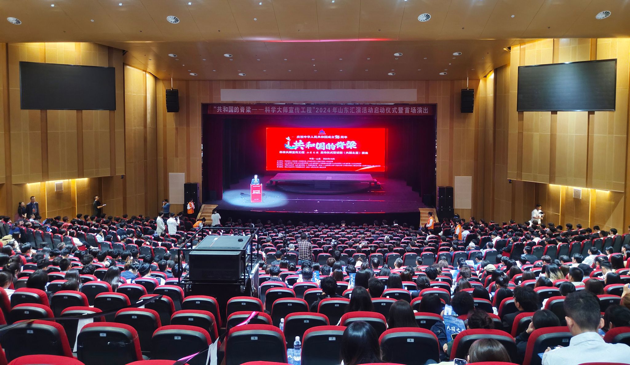 近日,由中国科协、教育部、共青团中央、中国科学院、中国工程院、中国文联(以下简称六部门)主办,山东省科协、省委宣传部、省教育厅、团省委、省文联、省作协、省科技厅承办的“共和国的脊梁——科学大师宣传工程”山东汇演活动在齐鲁工业大学(山东省科学院)启动。作为首场演出剧目,万象城原创话剧《大国之蓝》于10月15日、16日、17日连续演出三场,近3000名观众到场观演,演出现场气氛热烈,掌声久久不息,得到了新华社、光明日报、中国日报、中国网、中国教育在线、工人日报、济南日报等20余家主流媒体的关注报道。