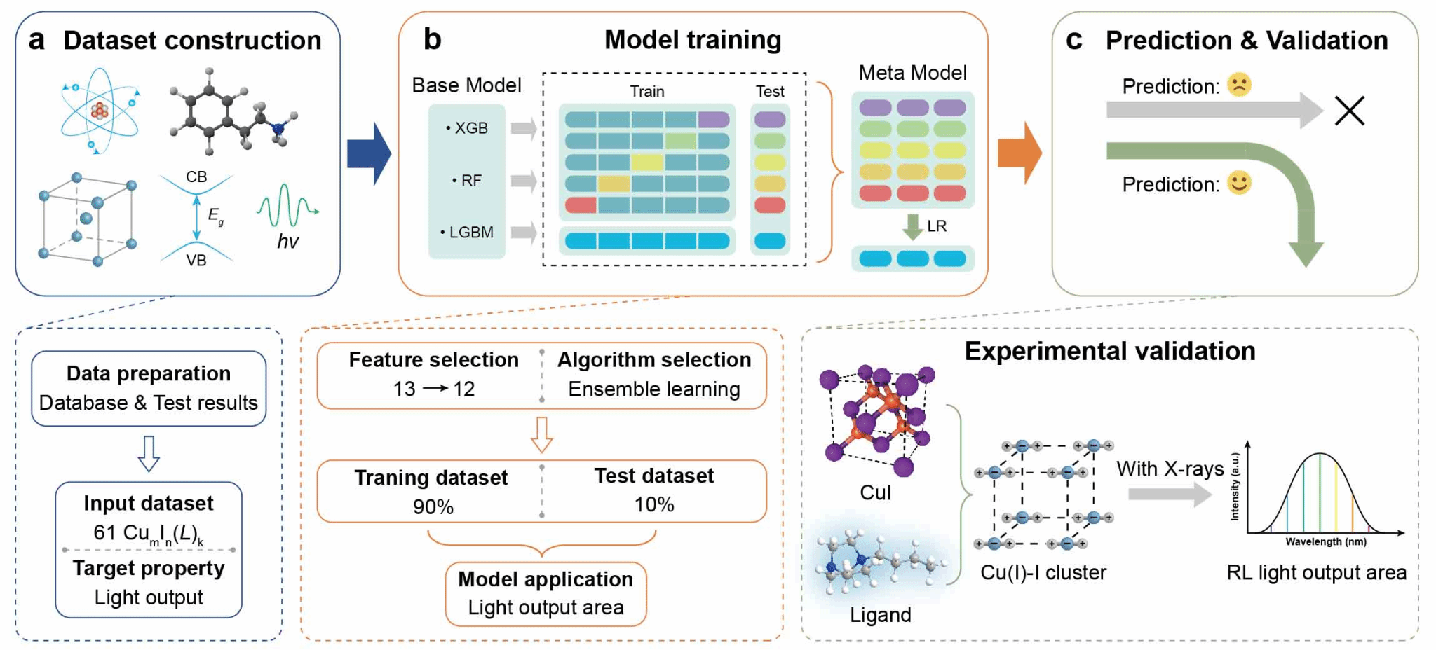 图1. 机器学习辅助筛选高性能铜碘团簇基簇闪烁体的流程图。