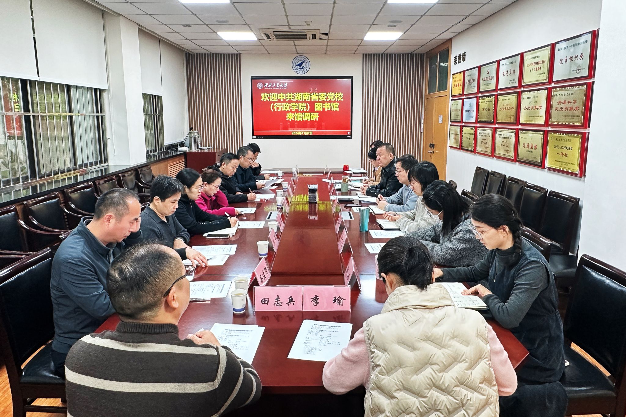 郝保权对中共湖南省委党校(湖南行政学院)图书馆同仁的到访表示欢迎。图书馆办公室(战略发展中心)主任郝天侠简要介绍了西工大图书馆的相关情况,包括图书馆的发展历程、现有资源、服务特色及未来规划等方面的成果和经验。