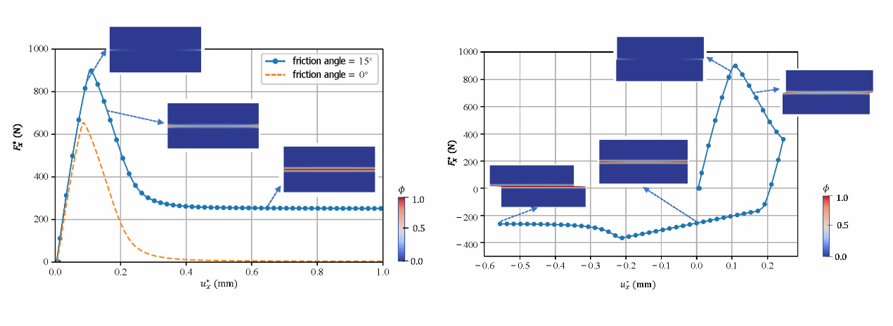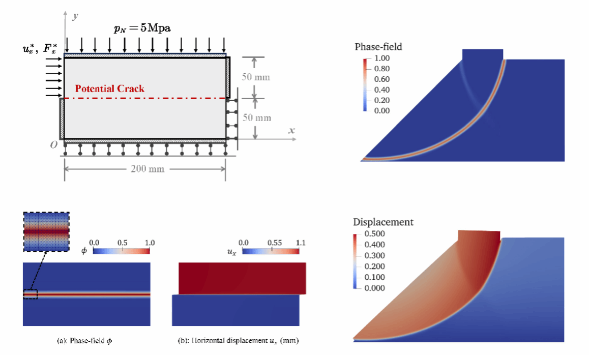 该研究成果基于两个基本的能量原理:能量守恒定律以及作为稳定性条件的变分不等式。通过严谨的推导,研究团队成功地提出了一种适用于摩擦和断裂耦合问题的相场方法。这一新模型在理论和数值模拟方面都显示出其优越性,特别是在预测裂纹的形核时机和方向上,与经典的摩尔–库仑摩擦破坏理论表现出高度的一致性。这为在复杂应力条件下预测材料和结构的破坏提供了一种全新的工具。
