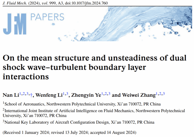 近期,由航空学院李楠、叶正寅、张伟伟团队的研究成果《双重激波/湍流边界层干扰的时均结构与非定常特征》(On the mean structure and unsteadiness of dual shock wave–turbulent boundary layer interactions)在流体力学顶级期刊《Journal of Fluid Mechanics》上刊发。该研究团队通过深入探讨激波与湍流边界层之间的相互作用,揭示了其时均结构和非定常特征。区别于以往针对单一激波干扰流动的研究,该研究重点关注承受过激波扰动的边界层如何再继续响应额外的激波干扰,为超声速/高超声速进气道内复杂形式的激波/边界层干扰现象提供了新的认识。这项研究不仅在学术界引起了广泛关注,而且对于航空航天工程、高速飞行器设计以及相关领域的技术进步具有重要的实际意义。